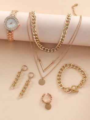 1pc Rhinestone Decor Quartz Watch & 5pcs Jewelry Set