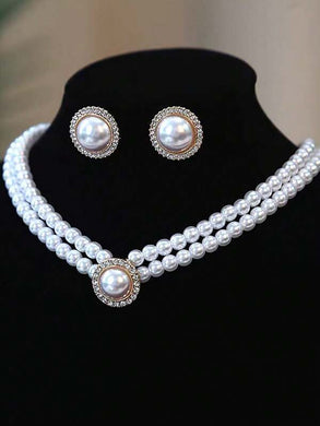 1pc Women's Fashionable Double Layer Faux Pearl & Rhinestone Nec