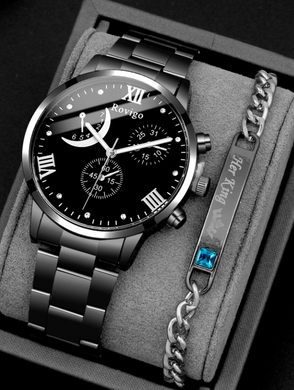 • 2pcs Fashion Business Gentleman Round Moon Men's Calendar Steel Band Quartz Watch with Cubic Zirconia Alloy Bracelet Combination Set