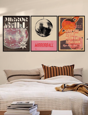 3 قطع من المطبوعات الفنية القماشية ذات الطراز العتيق ، ملصقات تحمل العنوان باللغة الإنجليزية تصور لقطة مقربة لكرات الديسكو تعكس الأضواء في مرقص ، مع نص عن الحب وصورة لكوكب على ورق مجعد. مناسبة لغرفة المعيشة وغرفة النوم ،.