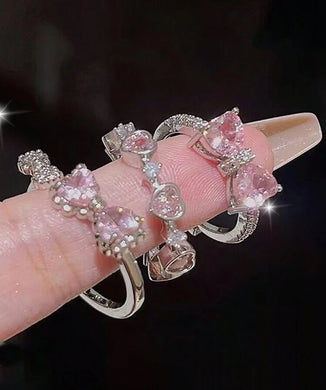 3 قطع/مجموعة خواتم ديكور على شكل قلب الحب الوردي وعقدة فيونكة وحجر الراين للنساء، رائعة للمواعدة وهدايا العطلات