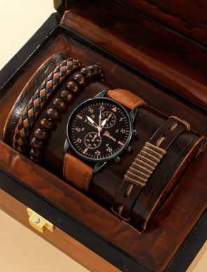 4 قطع طقم الجديد للرجال ساعات فاخر طقم سوار موضة اعمال بني جلد كوارتز رسغ ساعات للرجال هدية طقم