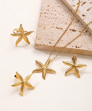 3قطعات مجموعة من الأقراط والخاتم والقلادة بتصميم نجمة البحر مطلية بالذهب عيار 18 قيراط من الفولاذ المقاوم للصدأ، مقاومة للماء، مناسبة للاستخدام اليومي، هدية