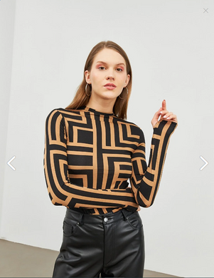 • Bukamiss Kadın Camel Labirent Desenli Bisiklet Yaka Parmak Detaylı Body prmk1