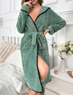 Contrast Binding Hooded Belted Flannel Robe