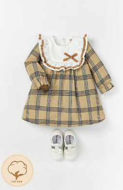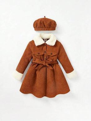 Cozy Cub للبنات الاطفال ياقة بورغ بتفاصيل رفرف حزام نسيج قطن فستان & قبعة