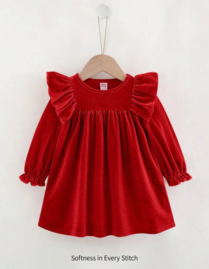 Cozy Pixies فستان طويل الأكمام للبنات، قطعة صلبة الخامة قطنية ناعمة، ياقة مستديرة، بتنورة مريشة الحافة، خصر مكشكش