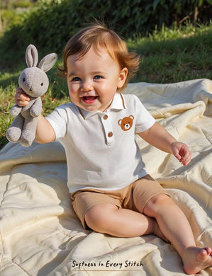 Cozy Pixies مجموعة مكونة من قطعتين للرضع من البنين/البنات: ملابس علوية بياقة بولو مطبوعة برسومات الدب كرتوني بأكمام قصيرة، وشورت بخصر مطاطي أحادي اللون